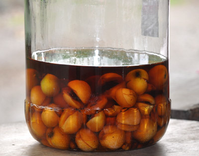 種に切り目を入れて、広口ビンに入れ、玄米焼酎に漬け込むだけです。一か月もすると茶色のエキスが出てきます。これでも飲めますが、古い方が良いので一年くらい寝かせるとより濃いびわ種酒ができます。オチョコ半杯を水で薄めてお飲みください。ハチミツを入れても美味しくお召し上がりいただけます。また焼酎に漬け込み、外用のびわ種エキスにもなります。